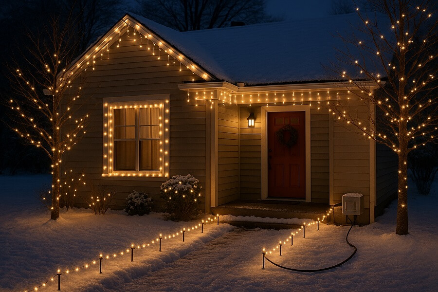 Гирлянды — классическое решение для праздничного оформления. Они представляют собой цепочки из небольших лампочек или светодиодов, которые могут быть выполнены в разных цветах и иметь различные режимы свечения. Гирлянды часто используют для украшения домов, ёлок, деревьев и других объектов в праздники. Их преимущества: